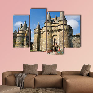 Castle of Vitr in Brittany, France is shown in a photorealistic landscape with a centered stone chateau, conical towers and a red bridge leading to the entrance beneath a blue sky with white clouds. The scene feels majestic and historic, a picturesque choice for living room or entryway decor.