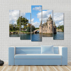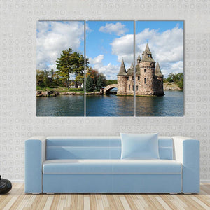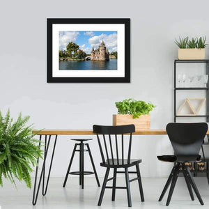This beautiful landscape features a majestic castle surrounded by lush trees and a serene river. The soft blues and greens create a picturesque scene, perfect for adding a calming atmosphere to any space.