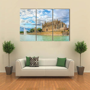 Cathedral De Mallorca Canvas Wall Art presents a photorealistic view of the cathedral by the waterfront, with a fountain and cumulus clouds under a bright blue sky. Rendered in vibrant blues, greens, tans, whites and greys, it conveys a grand, serene, historic mood that suits modern or traditional home decor.