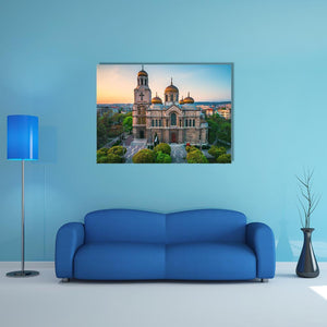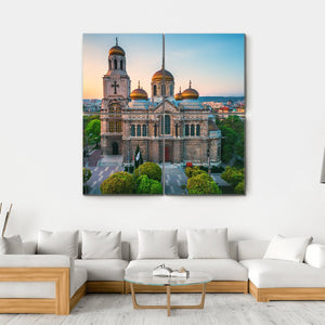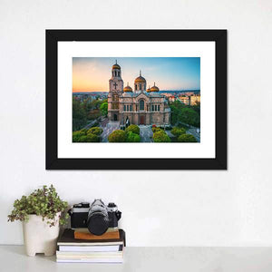 This captivating artwork features the majestic Cathedral in Varna, Bulgaria, viewed from an aerial perspective. Displaying a palette of gold, tan, green, and blue, it evokes a grand and peaceful atmosphere with its golden domes and the prominent cross on the steeple, surrounded by trees.