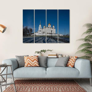 This canvas art captures a majestic white church with golden domes against a serene snowy landscape. The peaceful scene, featuring bare trees and soft shadows on the snow, brings a touch of tranquility to any space.