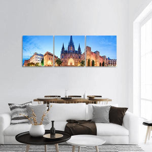 Capture the grandeur of Barcelona's iconic cathedral with this panoramic canvas wall art. The stunning representation of gothic architecture, featuring spires and arched windows, brings a serene, historic atmosphere to any space.