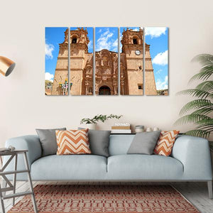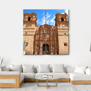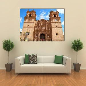 This canvas art showcases the majestic Cathedral of Puno, a traditional church with a grand symmetrical facade. Featuring ornate details such as twin towers and an arched doorway, it beautifully captures a serene moment under a blue sky with clouds, making it a striking addition to your wall decor.