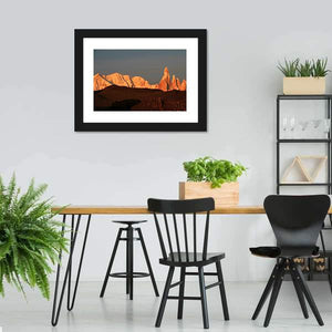 This canvas art captures the majestic Cerro Torre mountain range at sunrise. With jagged peaks illuminated by warm sunlight, it evokes a dramatic yet serene atmosphere that brings the beauty of nature indoors.