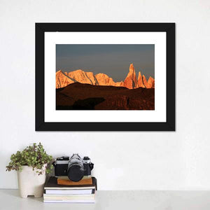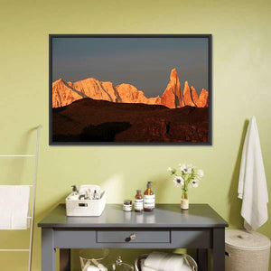 Cerro Torre at Sunrise captures a mountain range of sharp rock spires and sunlit peaks, rendered in warm oranges, browns and cool greys. The panoramic composition pairs dramatic, majestic light with dark earth in the foreground for a serene landscape that fits modern or natural-themed rooms.
