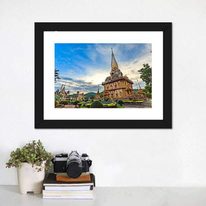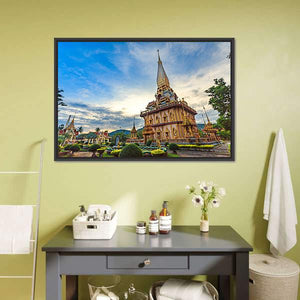 Chalong Temple Canvas Wall Art shows a wide-angle view of a golden temple and pagoda set among manicured gardens beneath wispy clouds. Rendered realistically in gold, blue, green and white tones, the scene feels serene, spiritual and majestic. It pairs well with living rooms, entryways, or quiet meditation spaces and modern or Asian-inspired décor.