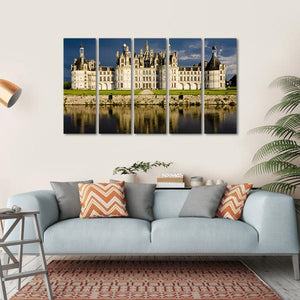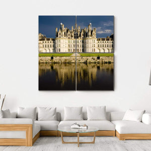 This artwork features the majestic Chambord Castle reflected in a serene river, surrounded by a tranquil landscape. The grand symmetry of the composition, paired with the rich blues and earthy tones, creates a calming atmosphere perfect for any room.
