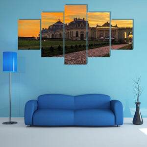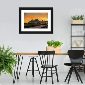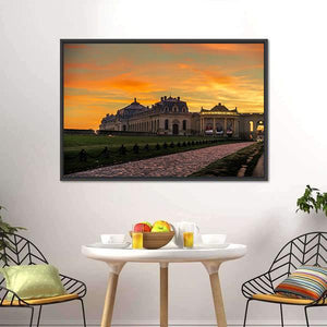Chantilly Castle Canvas Wall Art shows ornate castle architecture and a cobblestone pathway beneath a dramatic sunset sky. The photorealistic landscape uses orange and blue tones for a serene, dramatic mood that suits modern room decor.