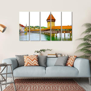 This canvas wall art depicts the iconic wooden covered bridge and octagonal tower of Luzern, Switzerland. With its serene palette of blue, brown, and green, it evokes a peaceful atmosphere perfect for enhancing any living space.