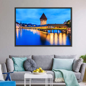 This canvas art captures the serene beauty of a covered bridge in Switzerland, reflecting warm lights on the river beneath a twilight sky. With its realistic style and calming palette of blue, brown, and yellow, it's a charming addition to any room decor.