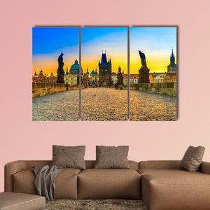 Charles Bridge and Old Town in Prague rendered as a photorealistic cityscape—statues line the cobblestone path and Gothic towers rise in the distance beneath a warm sunset. The blue, orange and yellow palette creates a vibrant yet serene mood, suited to living rooms, hallways, or home offices.