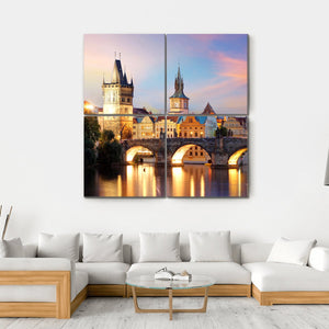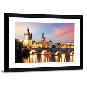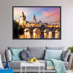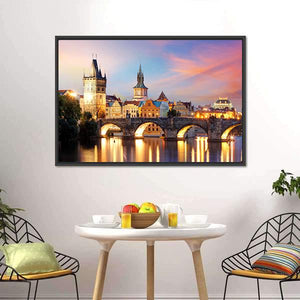 Capture the serene beauty of Prague's iconic Charles Bridge at night with this captivating canvas wall art. The warm sunset colors and deep blue tones evoke a romantic atmosphere, perfect for bringing a touch of history and elegance to your space.