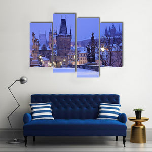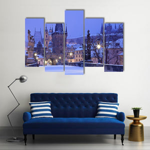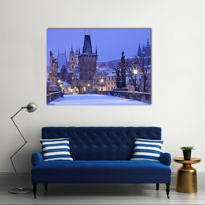 This canvas art features the enchanting Charles Bridge draped in snow, capturing the serene beauty of winter evenings in the Czech Republic. With its realistic imagery and a palette of blues and whites, it brings a magical atmosphere to your space.