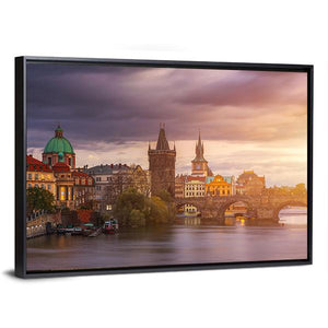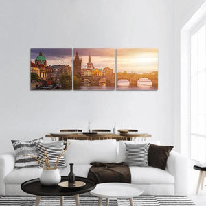 Aerial View Of Old Town Pier captures Prague’s Charles Bridge, Prague Castle and the Vltava River bathed in sunset light. This photorealistic panoramic print carries a serene, historic feel in golden, purple, brown and grey tones. It suits modern or historic-inspired interiors as a picturesque focal piece.
