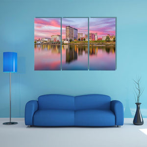 A modern city skyline beside a calm river, rendered in soft pinks, blues, greys, and white to suggest a peaceful twilight. Buildings of varying heights and their reflection in the water create a serene, calming scene. Works well in modern living spaces or offices as a quiet focal point.