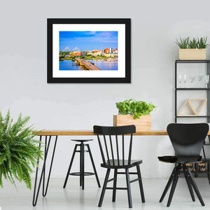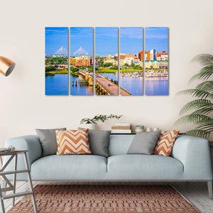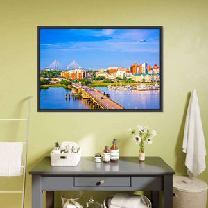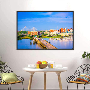 Capture the essence of Charleston with this vibrant canvas art featuring a picturesque city skyline, a striking suspension bridge, and boats gently docked along the waterfront. The bright blue and green palette evokes a sunny, urban atmosphere, making it a delightful addition to any wall décor.