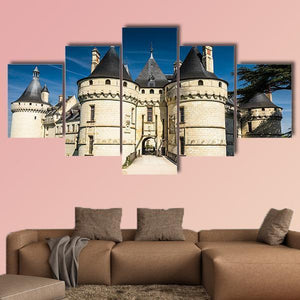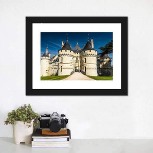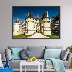 A realistic depiction of a stone castle with conical roofs, a bridge and a clear blue sky set over green grass. The scene feels grand, historical and quietly serene, making it a natural choice for modern home wall decor and classic interiors.