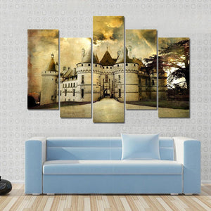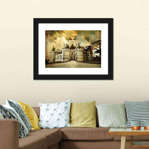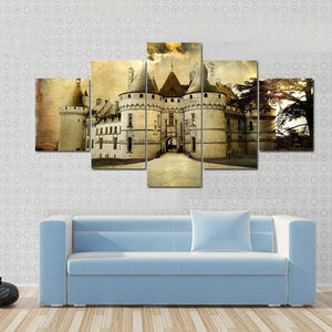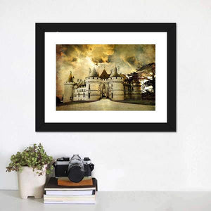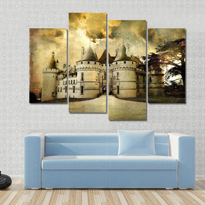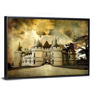 This canvas art features the majestic Chaumont Castle, surrounded by clouds and trees, creating a dramatic atmosphere. With a vintage style and a rich palette of gold, brown, grey, and white, it invites a timeless charm into any space.
