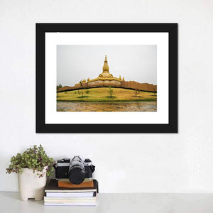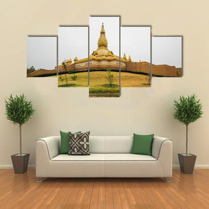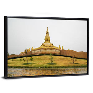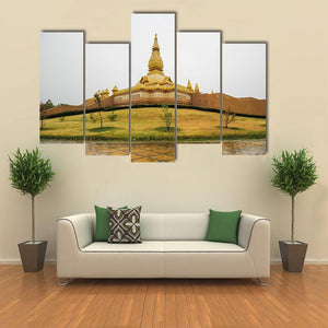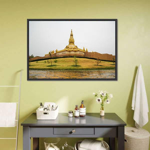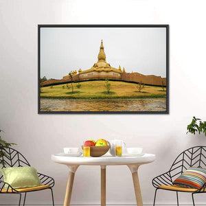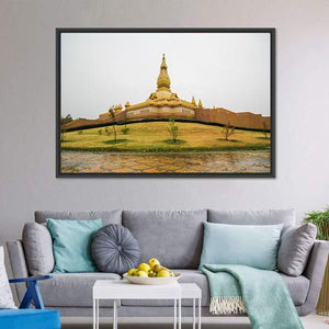 A photorealistic canvas of the temple Chedi Maha Mongkol Bua, centered on a golden pagoda seen from a wide, elevated viewpoint. Overcast light, a manicured lawn and reflective wet ground give the scene a serene, grand, spiritual feel. Works well in modern homes and room decor.