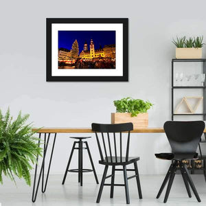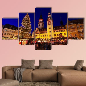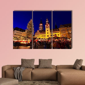 This canvas captures the Chemnitz Christmas market at night, showing a tall illuminated Christmas tree, festive stalls, ornate clock towers and people beneath city lights. The realistic, wide-shot scene uses blue, yellow, white and brown tones to convey a lively, enchanting holiday atmosphere. It fits modern interiors as seasonal wall decor.