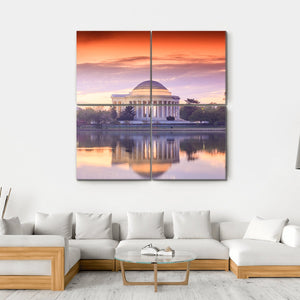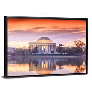 This captivating canvas features the iconic Jefferson Memorial surrounded by the tranquil Tidal Basin at sunset. With a serene palette of orange, pink, blue, and white, it captures a majestic atmosphere that invites contemplation.