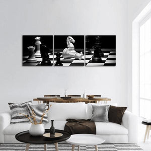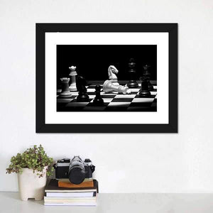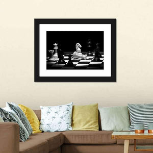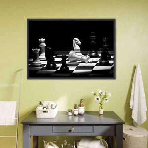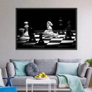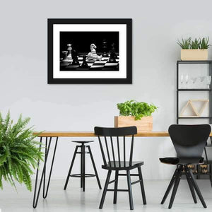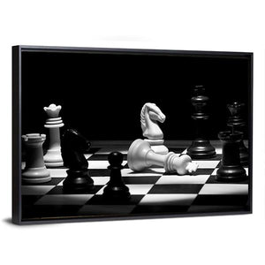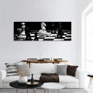 A photorealistic panoramic print of a chess board and pieces in black, white, and grey, lit with dramatic, wide-angle lighting to create an intense, strategic mood. A fallen white knight and contrasting black-and-white pieces add a cinematic, tactical moment—works well in modern living rooms or offices seeking bold monochrome wall decor.