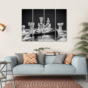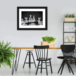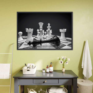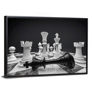 This artwork captures a dramatic moment in a chess game, featuring the stark contrast of white pieces against a reflective surface with a fallen black king in the foreground. Its intense atmosphere and minimalist style make it a striking addition to any wall decor.