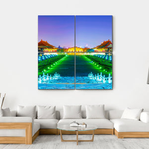 This canvas wall art captures the serene beauty of the Chiang Kai Shek Memorial Hall in Taiwan. With its vibrant colors and symmetrical composition, it showcases ornate railings, a tree-lined path, and illuminated buildings, creating a majestic atmosphere that enhances any space.