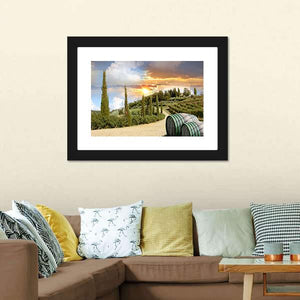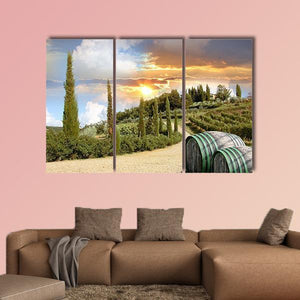 Chianti Vineyard Landscape Canvas Wall Art shows a sunlit vineyard with cypress trees, two wooden wine barrels in the foreground and a winding dirt road beneath a dramatic sunset sky. The scene feels serene and idyllic, with warm green, brown and orange tones that pair well with rustic or vintage interiors.