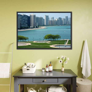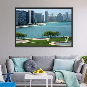 This canvas artwork captures the serene beauty of Chicago's skyline alongside its picturesque lakes. Featuring a bright palette of blues and greens, it evokes a tranquil urban atmosphere, perfect for adding a touch of modern elegance to your space.