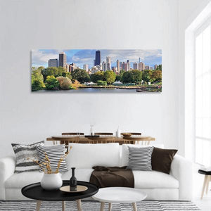 Chicago skyline with lakeside trees unfolds in a wide, realistic panoramic scene that reads as a peaceful, serene urban oasis. Soft blues, greens, browns, and grays highlight tall buildings, diverse foliage, and calm water. Suited to modern living rooms or offices as a calming focal piece.