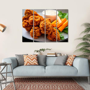 This canvas wall art captures a mouthwatering close-up of crispy fried chicken, creamy dipping sauce, and fresh carrot sticks. Its appetizing colors—rich browns, bright whites, and lively greens—bring a sense of comfort and casual dining to any space.
