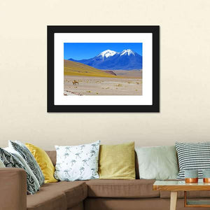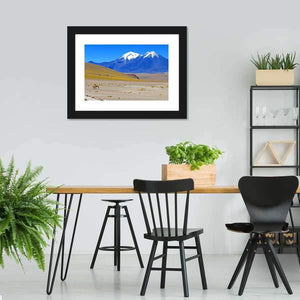 Chilean Landscape Canvas Wall Art depicts a realistic mountain range and desert landscape with snow-capped peaks, dry vegetation, and two vicuñas. Its blue, yellow, brown and white palette creates a serene, vast mood that works well with modern or natural room decor.