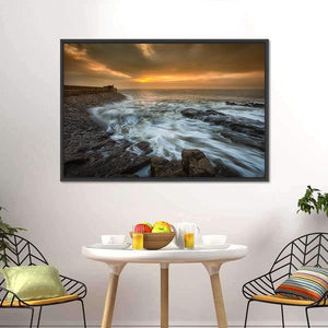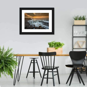 This canvas features the tranquil scene of ocean waves crashing against a rocky shore at sunset. With its dramatic interplay of orange, gray, and blue hues, this artwork captures a serene yet powerful moment, fitting beautifully in coastal-themed décor.