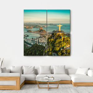 Celebrate the serene beauty of Brazil with this photorealistic canvas art featuring an aerial view of the iconic Christ the Redeemer statue overlooking the vibrant Botafogo Bay. The composition captures the majestic blend of mountains and ocean, creating an awe-inspiring scene for your wall decor.