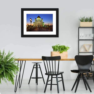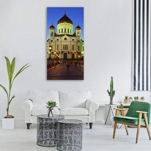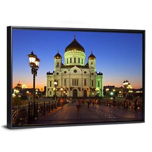 Christ The Savior Cathedral is captured lit at night with the cathedral, bridge and motion‑blurred people forming a centered, eye‑level cityscape that feels majestic and quietly active. The blue, gold and white palette fits modern living rooms or entryways and pairs well with neutral decor.