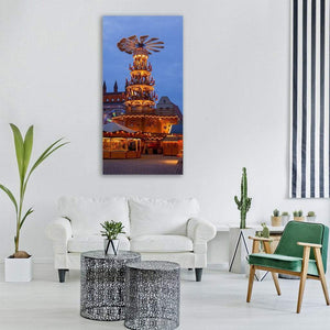 A centered scene of a Christmas market pyramid and festive stalls beneath an evening sky, painted in blue, orange, brown, and gold tones. Warm and inviting with a touch of magic, the print highlights illuminated stalls, decorated tiers, and a rotating pyramid top. It fits seasonal room decor for living rooms, hallways, or entryways.