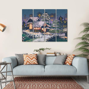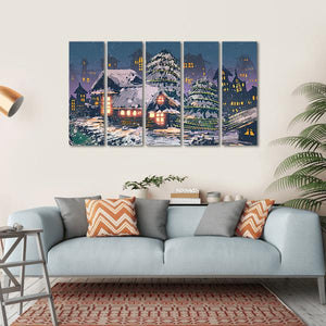 Capture the warmth of a snowy village at Christmas with this canvas wall art. Cozy cottages and festively lit Christmas trees create a welcoming winter scene, perfect for adding charm to your decor.