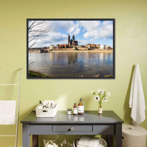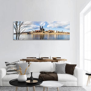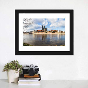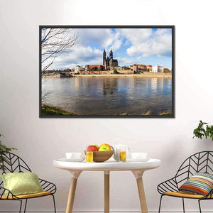Church in Magdeburg appears in a photorealistic panoramic canvas, with twin cathedral spires reflected in a calm river and partially bare tree branches at the edge. Cool blues, soft browns, white, and gray create a bright, scenic mood that fits modern room decor and cityscape-themed interiors.