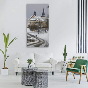 This canvas depicts a church beside a winding snowy road, conveying a serene, quiet winter mood. Rendered realistically in white, gray, brown and yellow tones with a visible steeple, red roof accents, bare trees and road signs, it brings calm, nature-inspired imagery to modern interiors and entryways.