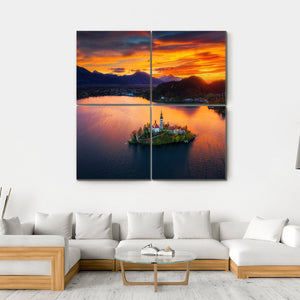 This serene canvas art captures the enchanting Church of Assumption set against a tranquil lake and majestic mountains. With a stunning sunset palette of orange, yellow, and blue, it evokes feelings of peace and reflection, perfect for adding a touch of nature to your home decor.