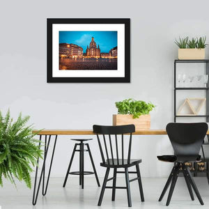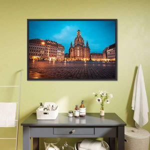 Neumarkt & Frauenkirche Canvas Wall Art shows a wide-angle, eye-level view of a neoclassical domed church, historic buildings, and a wet cobblestone plaza. Rendered realistically in blue, brown, gold, and white with glowing windows, the evening scene brings a calm, illuminated focal point to living rooms or entryways.