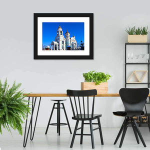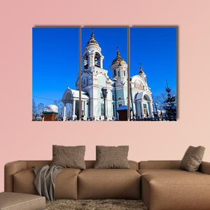 Church Of Sergius Of Radonezh in Russia is shown in a realistic, symmetrical composition with snow-dusted onion domes and a bell tower. Calm blue, white, gold and teal tones give the scene a serene, wintery atmosphere that fits modern or traditional home decor.