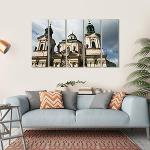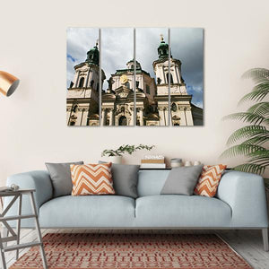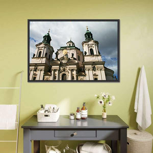 This canvas features a grand facade of the Church of St Nicholas, showcasing its ornate towers and domes. The somber mood is complemented by a palette of white, green, gold, grey, and blue, evoking the historic essence of this architectural masterpiece.