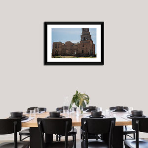Church Of The Kazan depicts a ruined church and a bell tower beneath a clear daytime sky. Muted browns, blues, greens, and grays give the scene a historic, desolate mood with a rustic, vintage character. This canvas fits rustic or vintage rooms as a weathered architectural focal point for wall decor.