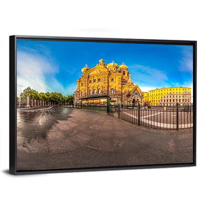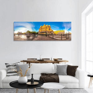 A panoramic photographic canvas showing the Kazan Cathedral and Nevsky Prospekt within a St. Petersburg cityscape. Rendered in blue, yellow, white, and grey, the scene feels grand, historic, and vibrantly lit—suited to both modern and classic interiors.