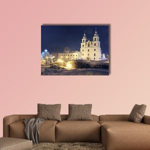 This serene canvas depicts a majestic church set in a snowy landscape at night. Its illuminated windows and two prominent spires create a peaceful, wintery atmosphere, perfect for enhancing any room's decor.