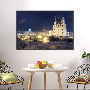 This canvas shows a snow-covered church on a quiet Christmas night, with spires and illuminated windows at the center. Rendered realistically in blues, whites, yellows and black, it offers a peaceful, serene, and gently festive mood that suits modern room decor and wall art collections.
