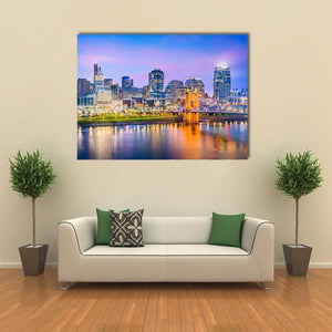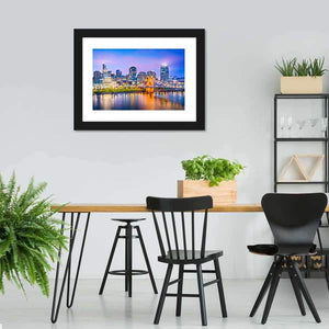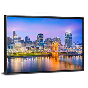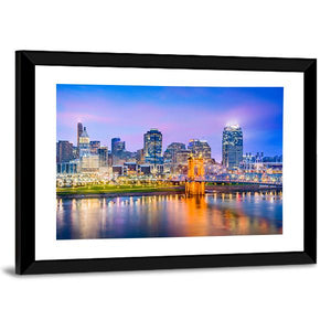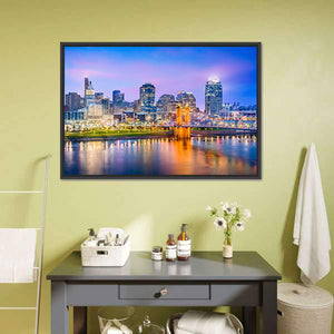 Capture the vibrant essence of Cincinnati with this stunning depiction of its skyline along the river. The artwork features illuminated skyscrapers and a graceful suspension bridge, all reflected beautifully on the water, creating a serene urban atmosphere. Perfect for adding a colorful touch to any room.