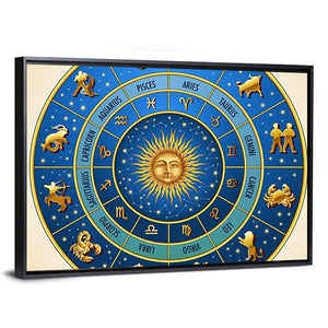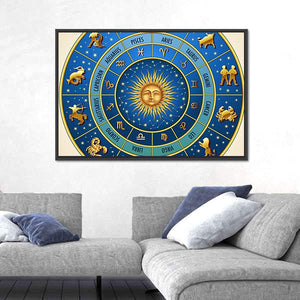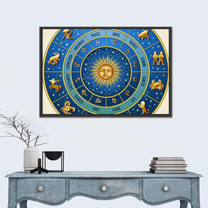 A canvas print featuring a circular zodiac wheel with the sun at its center, surrounded by astrology symbols and small constellations. The blue, gold, and white palette creates a cosmic, mystical, divine atmosphere that suits living room or bedroom decor. Each sign appears with its symbol and a matching illustration set against a star-dotted night-sky background.